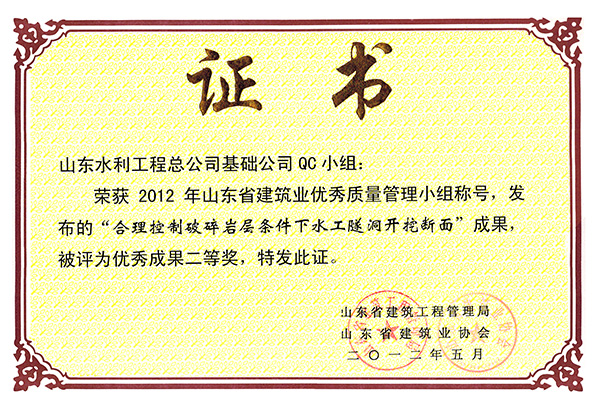 公司“合理控制破碎巖層條件下水工程隧洞開(kāi)挖斷面”等兩項(xiàng)成果榮獲2012年山東省建筑業(yè)優(yōu)秀質(zhì)量管理優(yōu)秀成果二等獎(jiǎng)