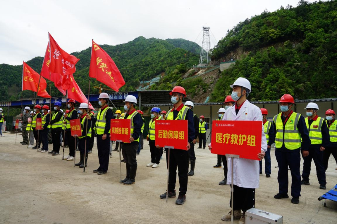 本次演練模擬背景為遭遇臺(tái)風(fēng)、強(qiáng)降雨引發(fā)的超標(biāo)準(zhǔn)洪水,針對(duì)聯(lián)合泄洪、邊坡巡護(hù)、圍堰加固、人員機(jī)械撤離、消防、人員救護(hù)等科目進(jìn)行了實(shí)戰(zhàn)化演練。