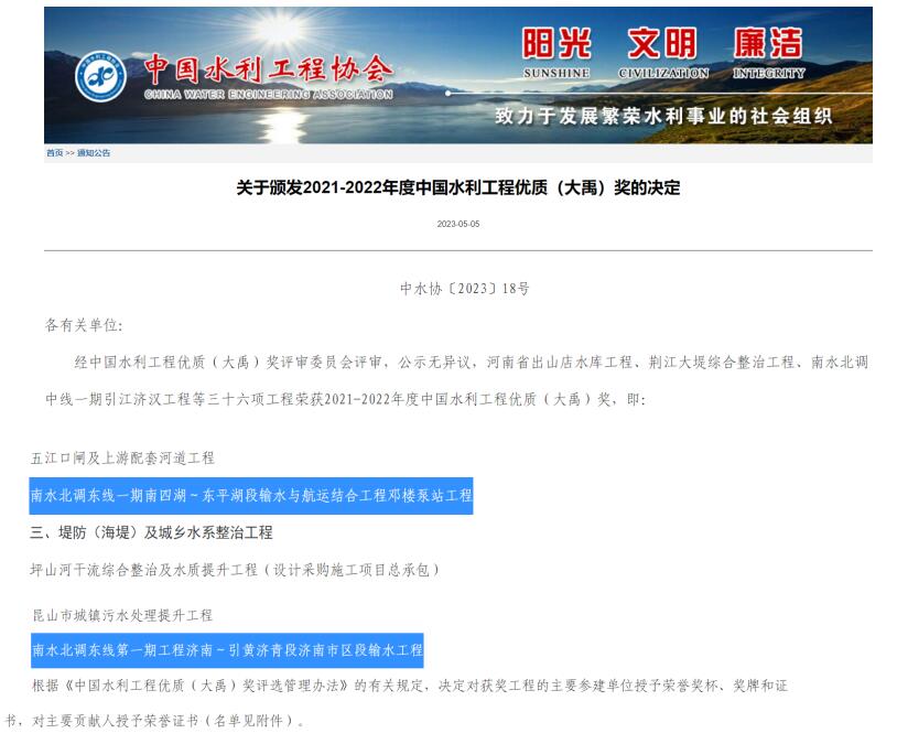 近日,中國水利工程協(xié)會發(fā)布《關(guān)于頒發(fā)2021-2022年度中國水利工程優(yōu)質(zhì)(大禹)獎的決定》,我公司參建的南水北調(diào)東線第一期工程濟(jì)南~引黃濟(jì)青段濟(jì)南市區(qū)段輸水工程和南水北調(diào)東線一期南四湖~東平湖段輸水與航運結(jié)合工程鄧樓泵站工程榮獲此項殊榮。