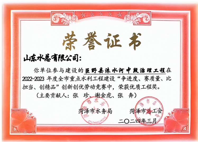 近日,菏澤市水務(wù)局、菏澤市總工會(huì)公布了“2022-2023年度全市重點(diǎn)水利工程建設(shè)“爭(zhēng)進(jìn)度、賽質(zhì)量、比擔(dān)當(dāng)、創(chuàng)精品”創(chuàng)新創(chuàng)優(yōu)勞動(dòng)競(jìng)賽”獲獎(jiǎng)名單,公司及權(quán)屬單位二局有限公司共榮獲優(yōu)質(zhì)工程1項(xiàng)、文明工地2項(xiàng)、QC成果1項(xiàng),優(yōu)秀項(xiàng)目經(jīng)理1項(xiàng)。