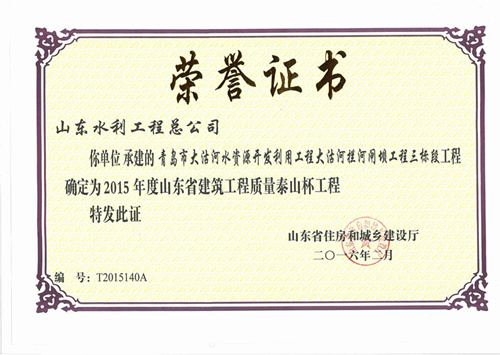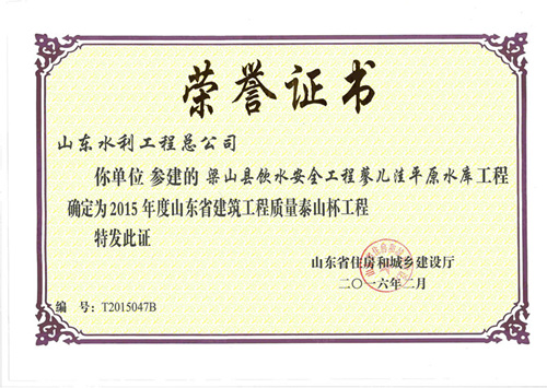 公司"梁山縣飲水安全工程蓼二洼平原水庫工程“等兩項工程榮獲2015年度山東省建筑工程質(zhì)量泰山杯