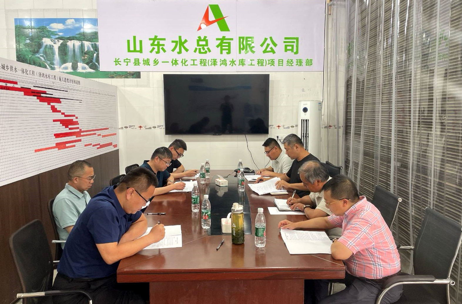 袁英杰一行深入項目施工現(xiàn)場,實地考察工程概況與目前進(jìn)展情況。隨后會議上,項目負(fù)責(zé)人就工程進(jìn)度、營收計劃、招標(biāo)采購情況以及存在問題等方面進(jìn)行了詳細(xì)匯報。袁英杰指出,各在建項目要嚴(yán)格控制工程進(jìn)度,保證各時間節(jié)點(diǎn)目標(biāo)順利達(dá)成,同時著重強(qiáng)調(diào)項目必須做好安全、質(zhì)量、防汛工作。針對項目現(xiàn)存問題,與會人員進(jìn)行了深入探討,檢查組提出切實可行的指導(dǎo)意見,并要求項目部及時完善收集變更索賠資料。