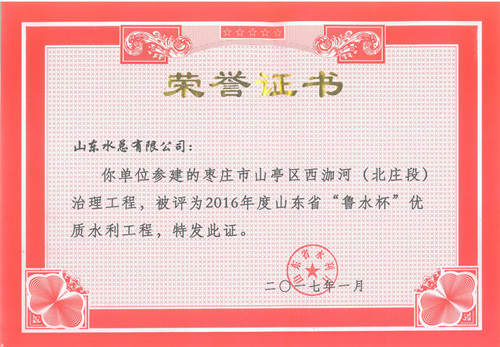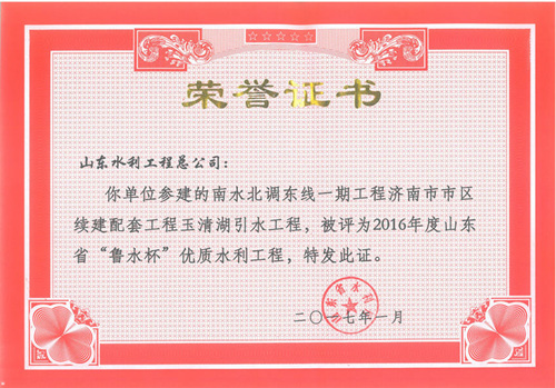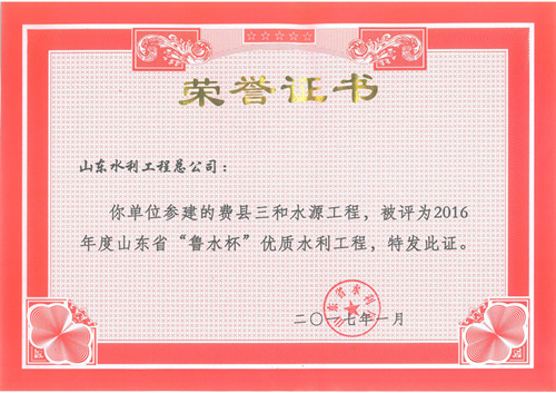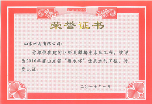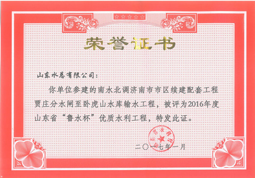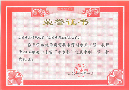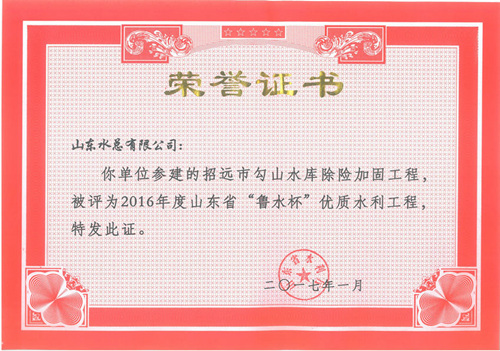 公司“招遠(yuǎn)市勾山水庫除險加固工程”等八項工程被評為2016年度山東省“魯水杯”優(yōu)質(zhì)水利工程