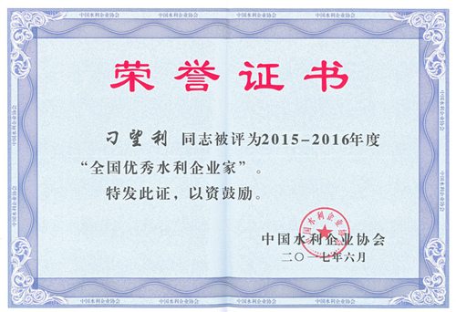 公司刁望利同志榮獲2015-2016年度“全國優(yōu)秀水利企業(yè)家”